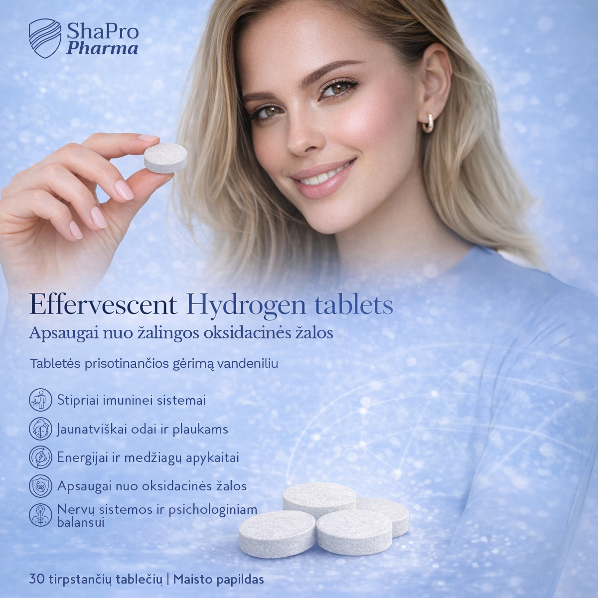 Modern scientific advancements allow us to discover new ways to maintain well-being, but sometimes the best solutions lie in simplicity – just one glass of water can have a significant impact on overall well-being. Hydrogen Tablets – a simple yet effective way to enrich your daily water intake and supplement your body with important substances. This is more than a simple supplement; it is an innovative solution that helps maintain body hydration and energy balance. The effervescent tablets easily dissolve in a simple glass of water, transforming it into a refreshing and nutrient-rich drink. As the tablet dissolves, free active hydrogen will also be formed in the glass, which is gaining increasing attention in the world of innovative nutrition.